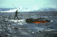 At this point of the eruption, one could navigate across the older flows to the ocean by following the pillar of smoke rising in the distance. The beautiful white smoke plume was caused when the flowing lava collided with the tidal currents of the ocean. This caused periodic explosions that sent molten lava cascading into the air with a tremendous boom.